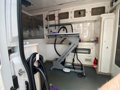 Our custom mobile salon is equipped with HVAC, a full-sized tub and water system, and all the tools needed to ensure your pup is groomed and pampered in luxury.